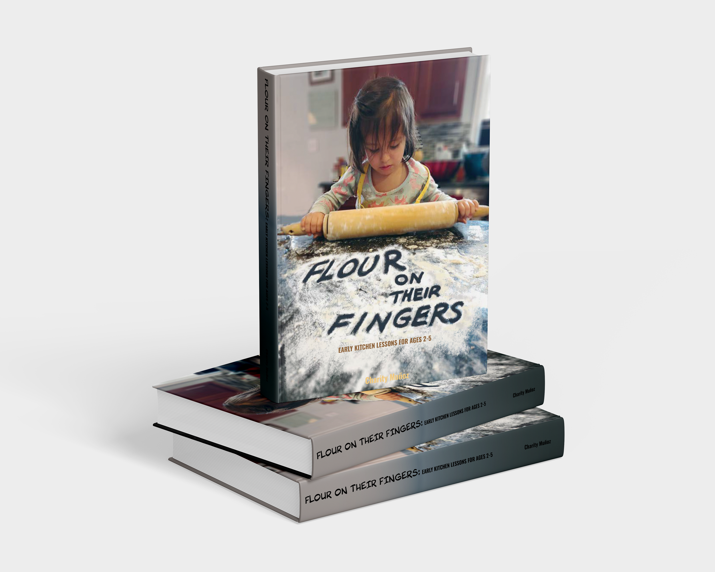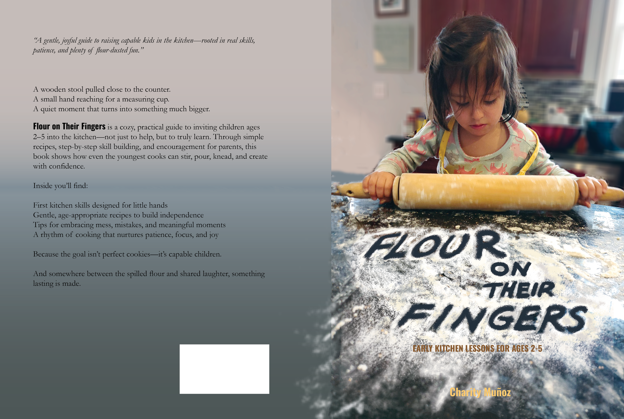 I assigned myself this project for book cover practice and it becaem a work of love. The photo is one I already possessed of my yournest daughter, then age 3. Since we always are in the kitchen together as a family, it seemed a good place to start. I came up with the idea of writing the title in the flour because that’s what she loves to do most.