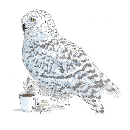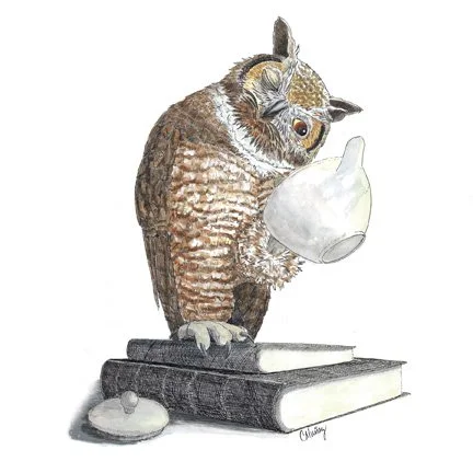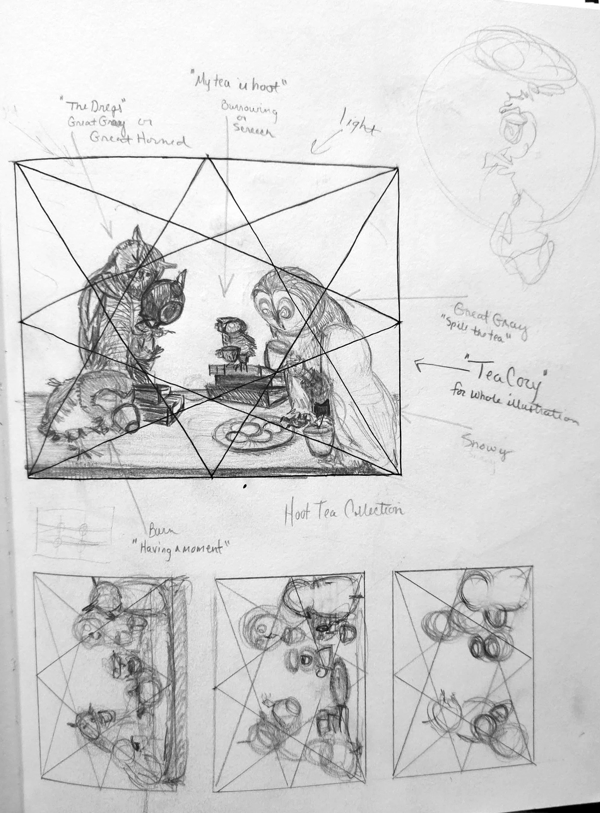 These owls came from a failed reading lesson with my youngest daughter. I asked, “what does T + owel make?” My daughter chirped back, “tea plus owl is a tea party!” The idea stuck and soon I was sketching thumbnails of an all-owl tea party.