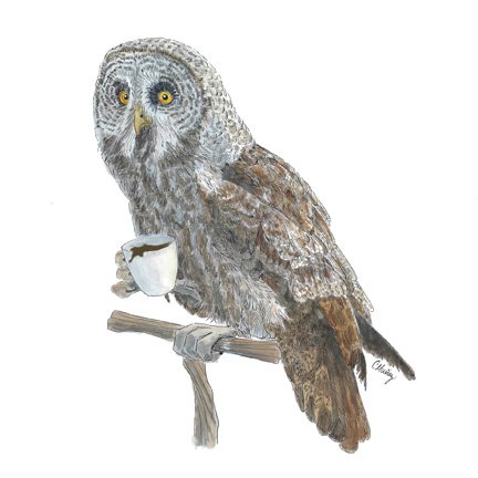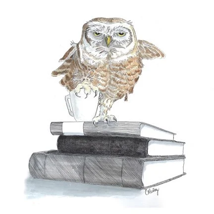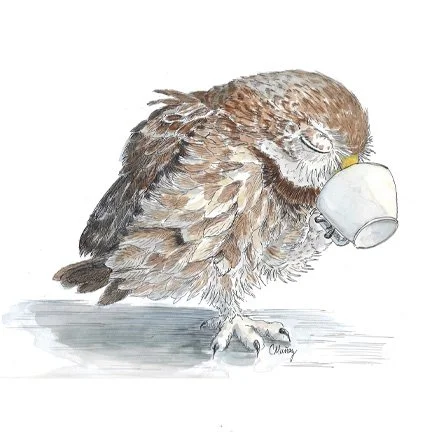 Each owl was drawn separately, allowing for a different species of owl and different mood as well. I added an element of fun when I named them, calling the whole group Tea Cozy.